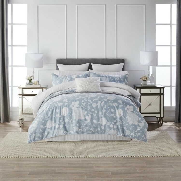 The Jane Lamerton Chelsea 300 Thread Count Cotton Sateen Quilt Cover Set will bring a decadent floral overhaul of your bedroom décor this season. Featuring a gorgeous white botanical pattern over a snowy blue base, this doona cover set also has a reversible bright white backdrop. You will be sleeping in comfortable luxury with this breathable silky smooth sateen doona cover set. Elevate your home with the Jane Lamerton bedding range at Harris Scarfe today.