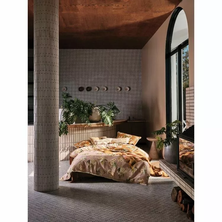 The Olli Cotton Quilt Cover Set by Linen House brings Australiana beauty to your bedroom. The iconic flowering-gum blossom is painted in warm natural tones that stand out against a soft dusty-pink cotton sateen background. Complimented by coordinating European pillowcases and cushion with cotton fringing, this quilt cover set is perfect for a soft, cosy touch.