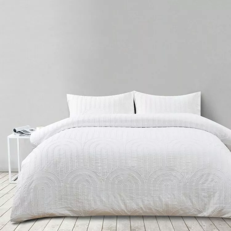 The Soren Clipped Clarity Quilt Cover Set will bring soft, crisp comfort to your bedroom, with a smooth-to-touch feel and features a trendy arch design which will elevate any bedroom decor. Sleep in peace and comfort by refreshing your bedroom interior with the Soren bedding range, available in-store and online at Harris Scarfe.