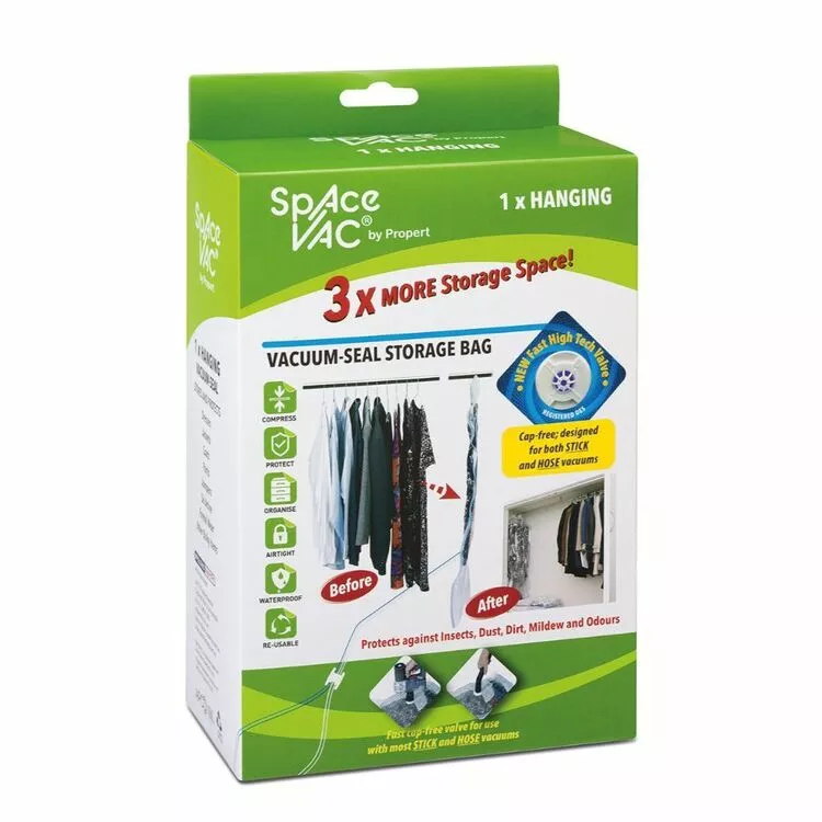 Compress, protect and organise your belongings with the Space Vac Hanging Bag, designed with enough space to fit 10 suits, coats, dresses or equivalent. The Space Vac Hanging Bag features 70 x 150 cm of durable multilayered polymer with a single way slider and new fast valve, designed to be compatible with 99% of vacuums. This provides durable, waterproof, and reusable protection.